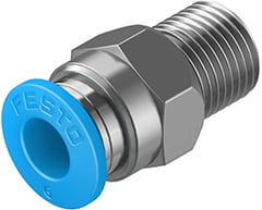 Festo Fitting QS-1/8-6, Festo QS, standard range of push-in fittings for pneumatic applications with a temperature range up to 80°C and a pressure range up to 14 bar. Tubing O.D. 4, 6, 8, 10, 12, 16 and 22 mm with connecting threads R1/8 … R1/2 and G1/8 … G3/4.